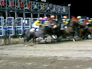 最終レース。出口近くのあたりで見ることにしました。ちょーど、スタートのゲートがある所。そこに走ってくる馬を写メに収めようと携帯を構えたんですが…私達、シャッターチャンスに遅れるらしく…毎回写るのは尻尾のみ(爆)…そこで、最後くらい、スタートの瞬間を…なんて、狙ってたんですが…いやー、大はしゃぎでした。傍から見たら、可笑しな2人だったんだろうなぁ…(笑)